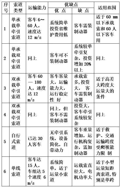 各类索道的能力、主要优缺点和应用范围