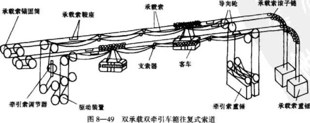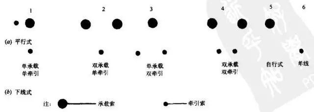 按支撑客车重量的承载索数虽分为单承载、双承载和无承载索三种类型,按牵引索的数量分为单牵引、双牵引和无牵引索三种类型。 故往复式索道共有单承载单牵引索道、单承载双牵引索道、双承载 单牵引索道、双承载双牵引索道、自行式索道(无牵引索)和单线索道(无承载索)等六种类型。