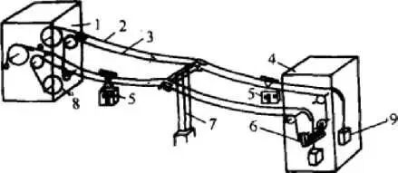 1-站房;2-承載索;3-牵引索;4-拉紧站;5-客车; 6-牵引索重锤;7-支架;8-驱动机;